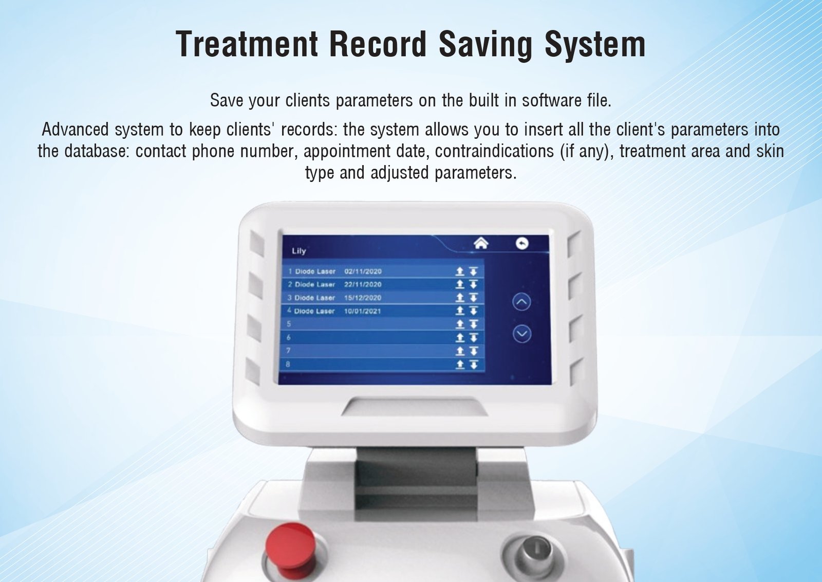 Advanced system to keep clients’ records: the system allows you to insert all the client’s parameters into the database: contact phone number, appointment date, contraindications (if any), treatment area and skin type and adjusted parameters.