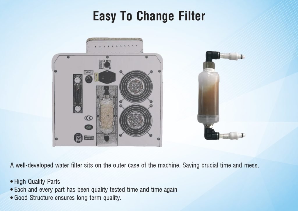 A well-developed water filter sits on the outer case of the machine. Saving crucial time and mess.