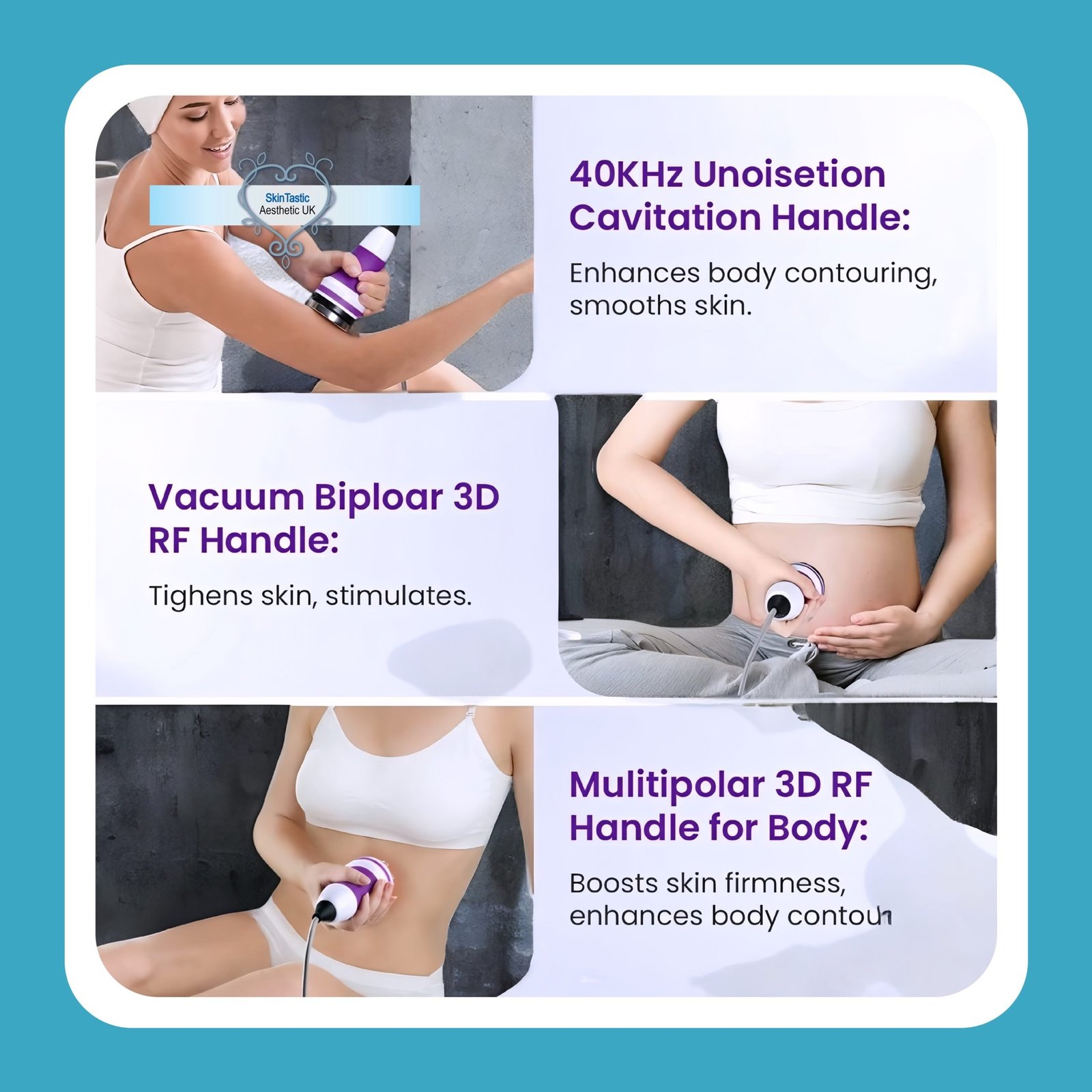 - Ultrasonic Cavitation – Targets and breaks down stubborn fat cells using low-frequency ultrasound, aiding in fat loss and inch reduction.