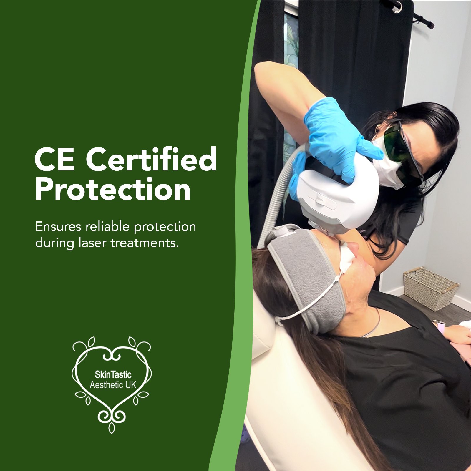 For client eye protection, particularly during facial treatments or procedures close to the eyes, we always recommend using total blocking eyewear or laser eye shields to ensure maximum safety.