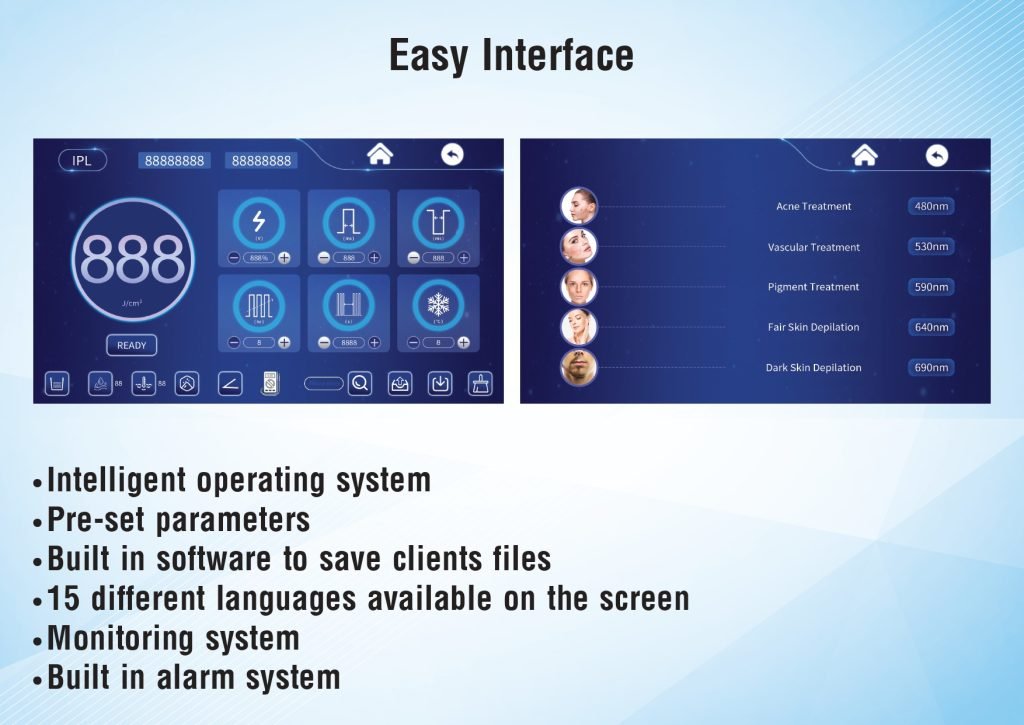 - Touchscreen Interface: Multi-language, pre-set parameters, and client file saving